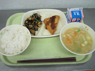 白飯 チーズハンペンフライ みそ汁大豆の磯煮 牛乳大豆は「畑の肉」といわれるほど、良質なたんぱく質と脂質が豊富です。大豆からできる製品も豆腐や納豆をはじめ、おから、厚揚げ、しょうゆ、きな粉、味噌、豆乳など、たくさんの食品に加工され、私たちの食生活に広く活用されています。