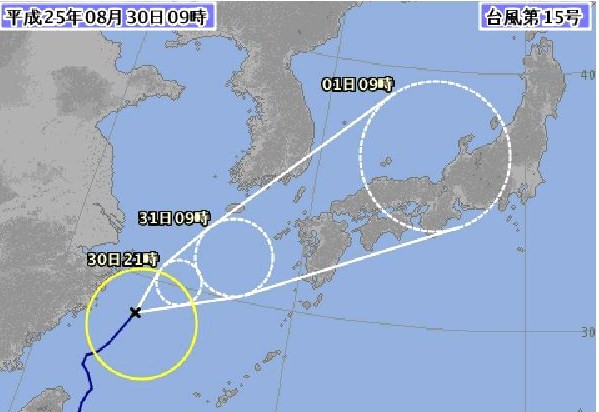 気象庁の発表によると、(8月30日10時30分発表)台風第15号は、30日9時には東シナ海に