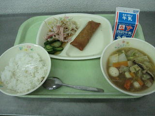 ご飯 八宝菜 春巻き もやしのナムル 牛乳
