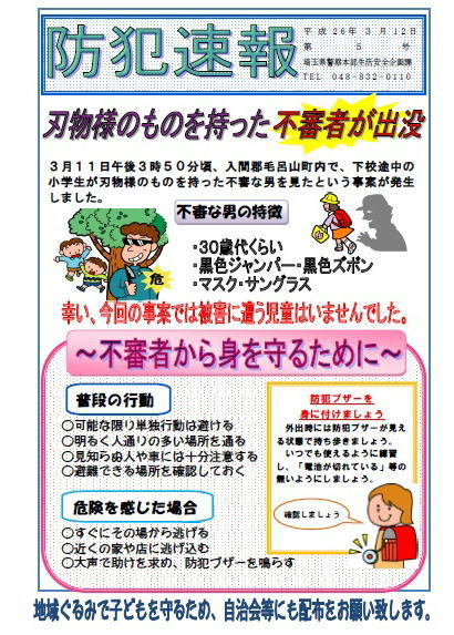 埼玉県警本部生活安全企画課より、防犯速報<第5号>~不審者の出没に