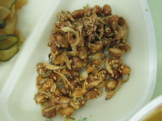 大豆とごぼうを揚げて、甘辛いタレで絡めました。