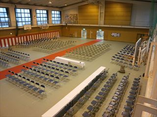 さあ、会場準備も終わりました。明日、3年生が歩く赤いカーペットも2年生の生徒が