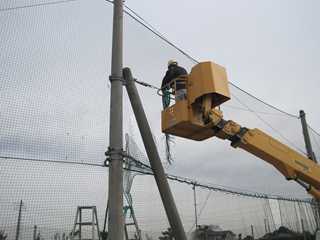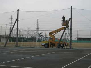 本日、校庭の防球ネットの修繕を業者の方が行っています。ネットの所々が、老朽化で破れている箇所がありましたので、それを直しています。これで、ボールも外に出ませんね。業者の方々ありがとうございました。