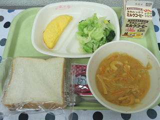 マカロニのヒリヒリ煮 グリーンサラダ コーヒー牛乳