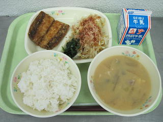 御飯、さんまのかばやき、おひたし、豚汁、牛乳