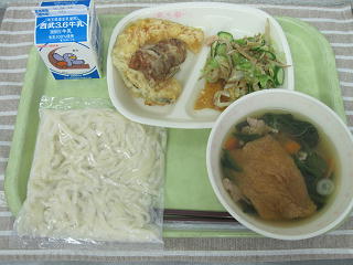 今日はきつねうどんに、かぼちゃと竹輪の天ぷらです。甘しょっぱく煮た