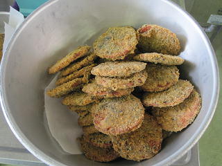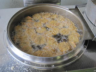 一人がバッター液をつけ、一人がパン粉をつけます。 揚げて完成!!