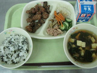 わかめご飯 豚肉とレバーのゴマダレ 切り干し大根のサラダ けんちん風汁 牛乳切り干し大根は、生の大根を細く切り、天日で干して乾燥させた食材です。太陽の光を浴びることで甘さが増し、良質の食物繊維や鉄分、カルシウムが豊富に含まれ、生の大根よりも栄養価がアップします。本日の給食ではサラダですが、炒めたり、煮物にしたり、細かく切ってコロッケやハンバーグに入れても美味しく食べられます。
