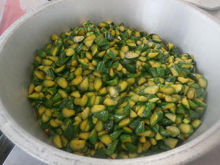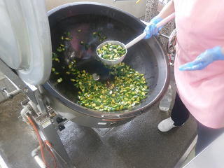 中華きゅうりは回転釜で作ります。調味料を沸騰させ、きゅうりを混ぜます。