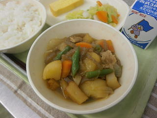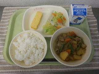 ご飯 厚焼き卵 肉じゃが 漬け物 牛乳