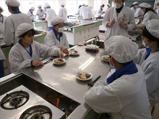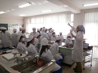 ました。始めに、実習の手順について先生から説明を聞き、各班で材料確認と調理を行