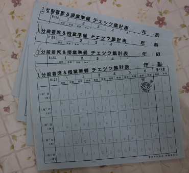 各教科の先生方に1年のまとめとして、ここまでは全員がクリアしてほしいという項目をまとめてもらいました。また、授業規律の徹底を図るために、評議委員と班長に『1分前着席&授業準備』を呼びかけてもらい、チェックしてもらいます。