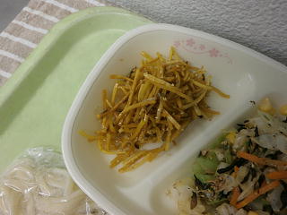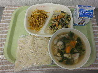 五目うどん 松葉芋 ツナとひじきのサラダ 牛乳
