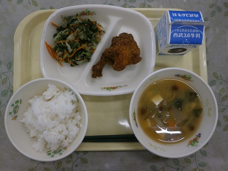今日の献立 牛乳 ご飯 チキンの香味焼き ヘルシーサラダ コーン入り中華スープ | 2025/10/23 | |  | by:給食室 |