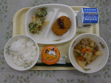 今日の献立 牛乳 ご飯 かぼちゃのコロッケ 和風サラダ 豚肉と大根の煮込み パンプキンババロア | 2025/10/29 | |  | by:給食室 |