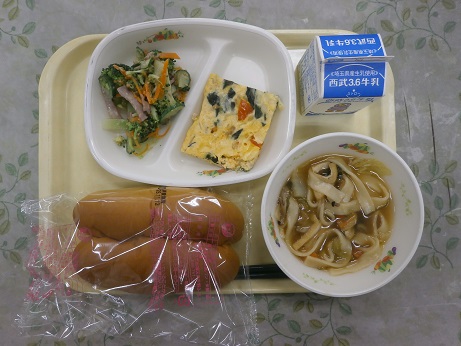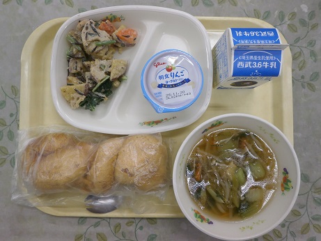 今日の献立 牛乳 黒糖きな粉揚げパン 彩の国サラダ クイッティオスープ ヨーグルト | 2025/11/04 | |  | by:給食室 |