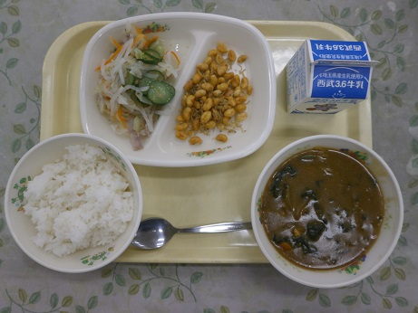 今日の献立 牛乳 ご飯 大豆のカリカリ揚げ ハムと大根のサラダ スピナッチカレー | 2025/11/05 | |  | by:給食室 |