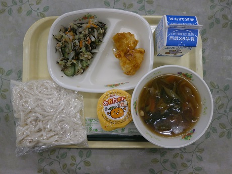 今日の献立 牛乳 深谷ねぎたっぷりうどん みそポテト ツナとひじきのサラダ オレンジゼリー | 2025/11/06 | |  | by:給食室 |